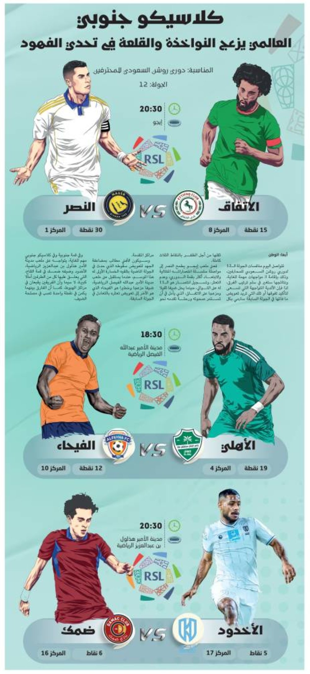 وفي قمة جنوبية وفي كلاسيكو جنوبي مهم للغاية، يتواجه على ملعب مدينة الأمير هذلول بن عبدالعزيز الرياضية، الأخدود وضيفه ضمك في قمة القاع، التي يعلق عليها كل من الطرفين آمالا كبيرة، لا سيما وأن الفريقين يقبعان في مراكز الهبوط، كما أن الفارق بينهما يكمن في نقطة واحدة تصب في مصلحة الضيف.