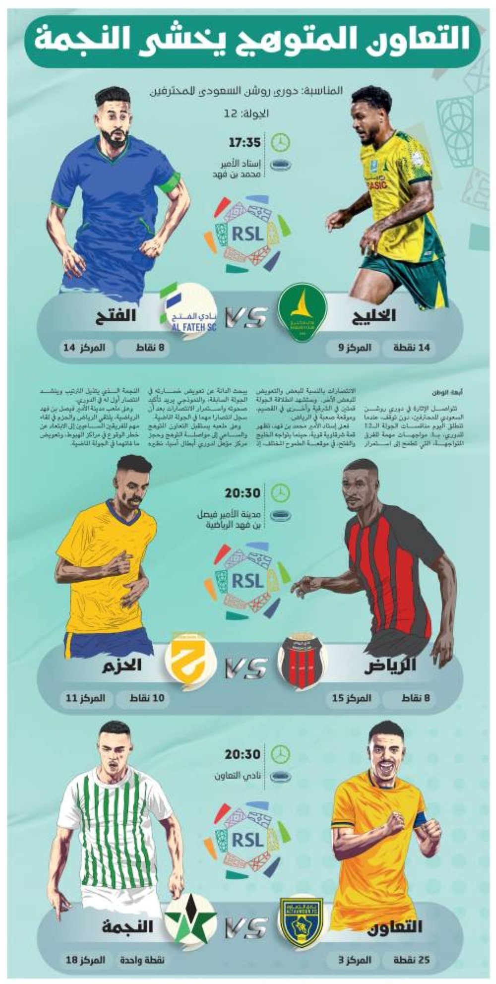 تتواصل اﻹثارة في دوري روشن السعودي للمحترفين، دون توقف، عندما تنطلق اليوم منافسات الجولة الـ12 للدوري، بـ3 مواجهات مهمة للفرق المتواجهة، التي تطمح إلى استمرار الانتصارات بالنسبة للبعض والتعويض للبعض الآخر. وستشهد انطلاقة الجولة قمتين في الشرقية وأخرى في القصيم، وموقعة صعبة في الرياض.