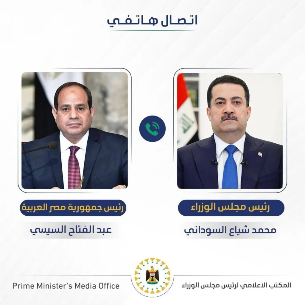 وقال المكتب الإعلامي لرئيس مجلس الوزراء، في بيان تلقته (اليوم الاخبارية)، إن “رئيس مجلس الوزراء محمد شياع السوداني أجرى، اليوم الأحد، مباحثات هاتفية مع رئيس جمهورية مصر العربية عبد الفتاح السيسي”.