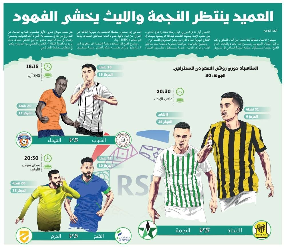ويتطلع الشباب إلى مواصلة صحوته وتقدمه نحو مناطق الأمان ومراكز الدفء، عندما يستقبل، نظيره الفيحاء الساعي إلى استمرار سلسلة الانتصارات للجولة الثالثة على التوالي، من أجل تأكيد عدم تراجعه للمناطق الخطرة، وذلك على ملعب (SHG) آرينا.