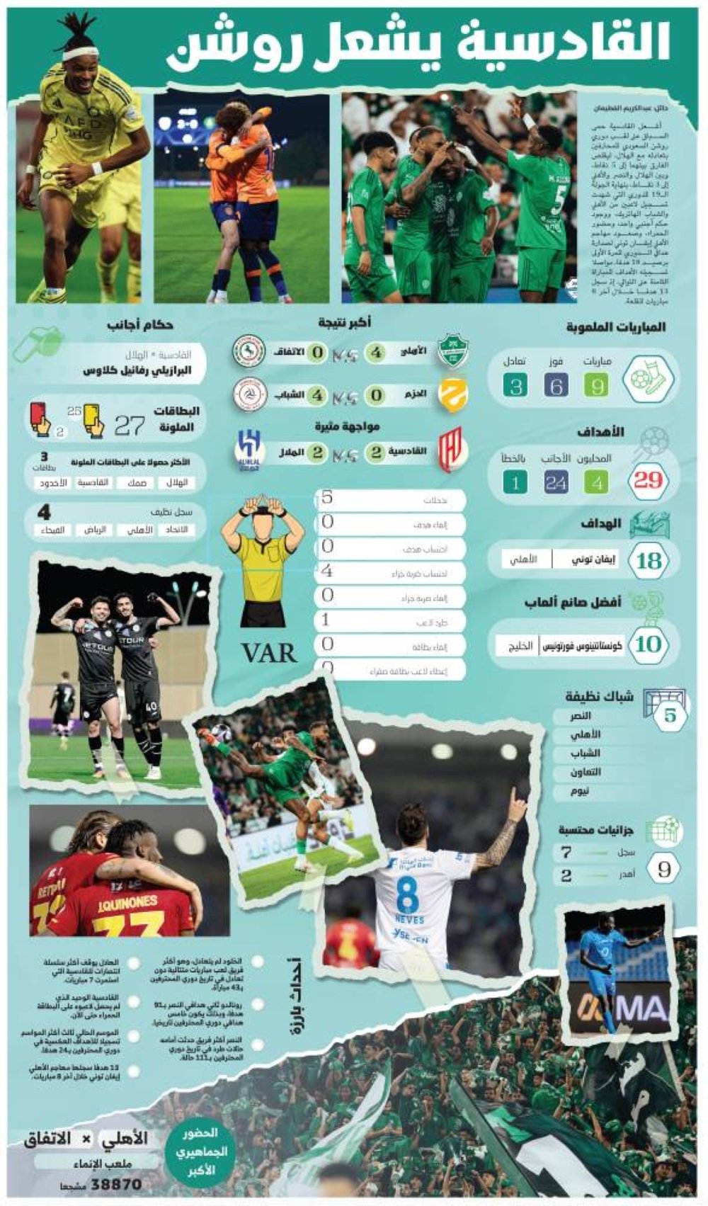 أشعل القادسية حمى السباق على لقب دوري روشن السعودي للمحترفين بتعادله مع الهلال، ليقلص الفارق بينهما إلى 5 نقاط، وبين الهلال والنصر والأهلي إلى 3 نقاط، بنهاية الجولة الـ19 للدوري التي شهدت تسجيل لاعبين من الأهلي والشباب الهاتريك، ووجود حكم أجنبي واحد، وحضور الحمراء، وصعود مهاجم الأهلي إيفان توني لصدارة هدافي الدوري للمرة الأولى برصيد 18 هدفا، مواصلا تسجيله الأهداف للمباراة الثامنة على التوالي، إذ سجل 13 هدفا خلال آخر 8 مباريات للقلعة.