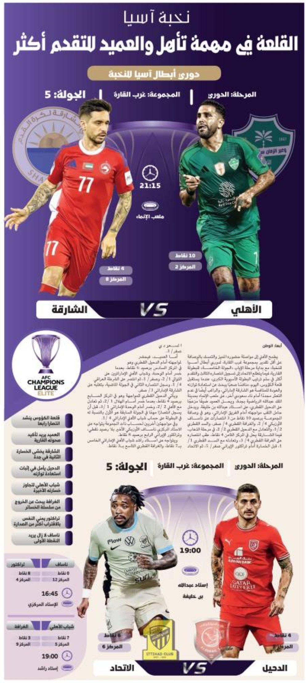 يطمح الأهلي إلى مواصلة حضوره المميز والتمسك بالوصافة على أقل تقدير بمجموعة غرب القارة، لدوري أبطال آسيا للنخبة، مع بداية مرحلة الإياب «الجولة الخامسة» للبطولة القارية، فيما يتطلع الاتحاد إلى تسجيل انتصاره الثالث والتقدم أكثر في سلم ترتيب البطولة الآسيوية الكبرى، عندما يستقبل قلعة الكؤوس، اليوم، منافسًا صعبًا يبحث عن استعادة توازنه والعودة للمنافسة هو الشارقة اإماراتي، والراغب أيضًا في عدم التعثر مجددًا أمام ناد سعودي آخر، على ملعب الإنماء بمدينة الملك عبدالله الرياضية بجدة، ويحل العميد ضيفًا مزعجًا على الدحيل القطري، على استاد عبدالله بن خليفة. ويدخل حامل اللقب مواجهته أمام الفريق الإماراتي، وهو في وصافة المجموعة برصيد 10 نقاط من 3 انتصارات على ناساف الأوزبكي 4/ 2، والغرافة القطري 4/ صفر، والسد القطري 2/1، والتعادل مع الدحيل القطري 2/ 2، في مرحلة الذهاب، فيما الشارقة يحل في المركز الثامن 4 نقاط، عقب انتصاره على الغرافة القطري 4/ 3، وتعادله مع السد القطري 1/ 1، قبل الخسارة أمام تراكتور الإيراني صفر/ 5، ثم الاتحاد السعودي صفر/ 3.