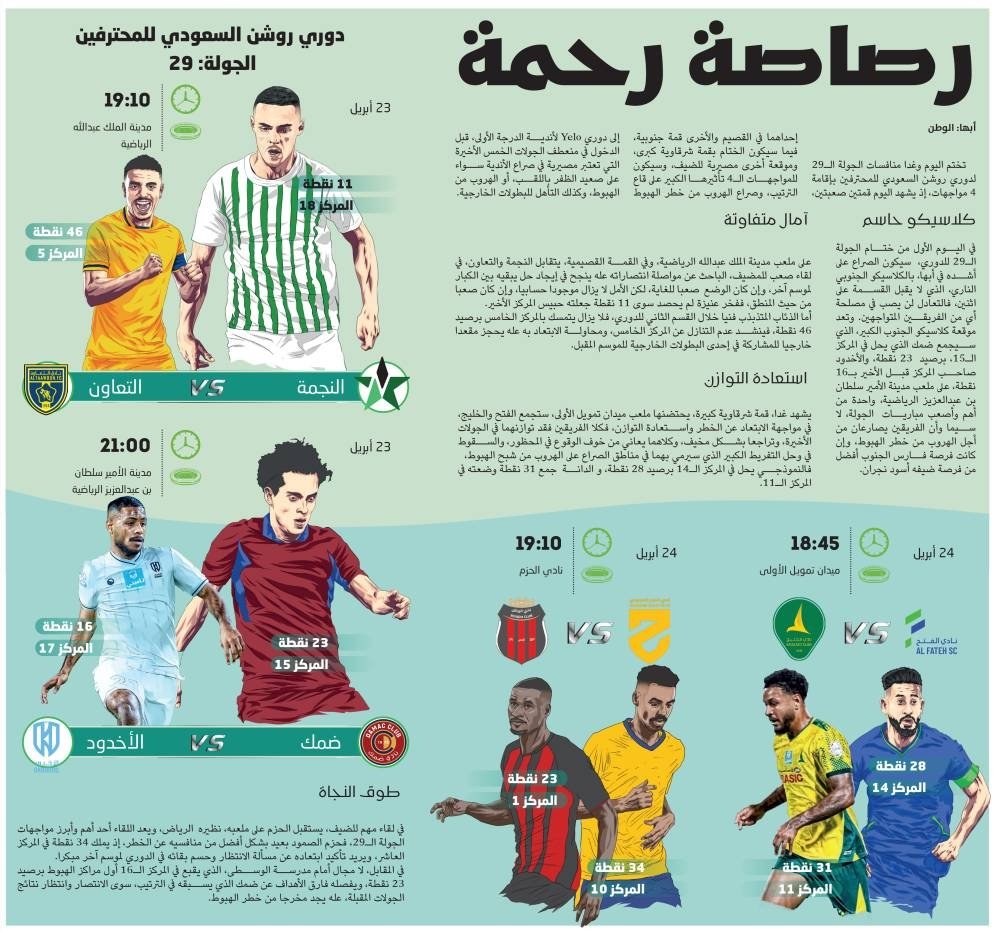 تختم اليوم وغدا منافسات الجولة الـ29 لدوري روشن السعودي للمحترفين بإقامة 4 مواجهات، إذ يشهد اليوم قمتين صعبتين، إحداهما في القصيم والأخرى قمة جنوبية، فيما سيكون الختام بقمة شرقاوية كبرى، وموقعة أخرى مصيرية للضيف، وسيكون للمواجهات الـ4 تأثيرها الكبير على قاع الترتيب، وصراع الهروب من خطر الهبوط إلى دوري Yelo لأندية الدرجة الأولى، قبل الدخول في منعطف الجولات الخمس الأخيرة التي تعتبر مصيرية في صراع الأندية سواء على صعيد الظفر باللقب، أو الهروب من الهبوط، وكذلك التأهل للبطولات الخارجية.**media[1249045]**كلاسيكو حاسمفي اليوم الأول من ختام الجولة الـ29 للدوري، سيكون الصراع على أشده في أبها، بالكلاسيكو الجنوبي الناري، الذي لا يقبل القسمة على اثنين، فالتعادل لن يصب في مصلحة أي من الفريقين المتواجهين. وتعد موقعة كلاسيكو الجنوب الكبير، الذي سيجمع ضمك الذي يحل في المركز الـ15، برصيد 23 نقطة، والأخدود صاحب المركز قبل الأخير بـ16 نقطة، على ملعب مدينة الأمير سلطان بن عبدالعزيز الرياضية، واحدة من أهم وأصعب مباريات الجولة، لا سيما وأن الفريقين يصارعان من أجل الهروب من خطر الهبوط، وإن كانت فرصة فارس الجنوب أفضل من فرصة ضيفه أسود نجران.آمال متفاوتةعلى ملعب مدينة الملك عبدالله الرياضية، وفي القمة القصيمية، يتقابل النجمة والتعاون، في لقاء صعب للمضيف، الباحث عن مواصلة انتصاراته عله ينجح في إيجاد حل يبقيه بين الكبار لموسم آخر، وإن كان الوضع صعبا للغاية، لكن الأمل لا يزال موجودا حسابيا، وإن كان صعبا من حيث المنطق، ففخر عنيزة لم يحصد سوى 11 نقطة جعلته حبيس المركز الأخير.أما الذئاب المتذبذب فنيا خلال القسم الثاني للدوري، فلا يزال يتمسك بالمركز الخامس برصيد 46 نقطة، فينشد عدم التنازل عن المركز الخامس، ومحاولة الابتعاد به عله يحجز مقعدا خارجيا للمشاركة في إحدى البطولات الخارجية للموسم المقبل.استعادة التوازنيشهد غدا، قمة شرقاوية كبيرة، يحتضنها ملعب ميدان تمويل الأولى، ستجمع الفتح والخليج، في مواجهة الابتعاد عن الخطر واستعادة التوازن، فكلا الفريقين فقد توازنهما في الجولات الأخيرة، وتراجعا بشكل مخيف، وكلاهما يعاني من خوف الوقوع في المحظور، والسقوط في وحل التفريط الكبير الذي سيرمي بهما في مناطق الصراع على الهروب من شبح الهبوط،فالنموذجي يحل في المركز الـ14 برصيد 28 نقطة، و الدانة جمع 31 نقطة وضعته في المركز الـ11.طوق النجاةفي لقاء مهم للضيف، يستقبل الحزم على ملعبه، نظيره الرياض، ويعد اللقاء أحد أهم وأبرز مواجهات الجولة الـ29، فحزم الصمود بعيد بشكل أفضل من منافسيه عن الخطر، إذ يملك 34 نقطة في المركز العاشر، ويريد تأكيد ابتعاده عن مسألة الانتظار وحسم بقائه في الدوري لموسم آخر مبكرا.في المقابل، لا مجال أمام مدرسة الوسطى، الذي يقبع في المركز الـ16 أول مراكز الهبوط برصيد 23 نقطة، ويفصله فارق الأهداف عن ضمك الذي يسبقه في الترتيب، سوى الانتصار وانتظار نتائج الجولات المقبلة، عله يجد مخرجا من خطر الهبوط.