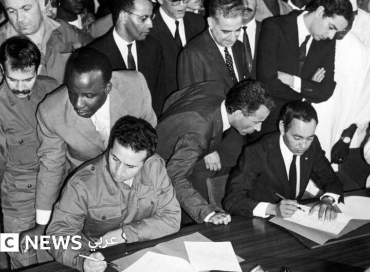 صدر الصورة، Getty Images التعليق على الصورة، الرئيس الجزائري أحمد بن بلة والعاهل المغربي الملك الحسن الثاني...