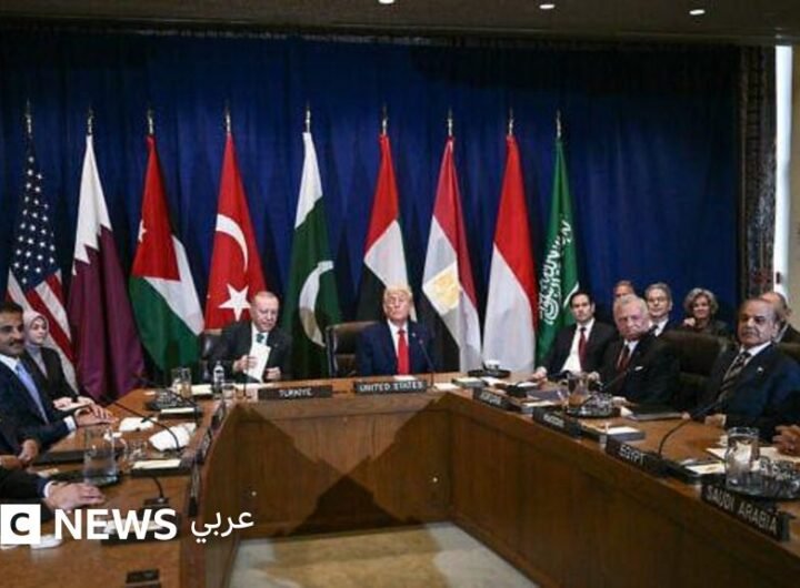 صدر الصورة، AFP التعليق على الصورة، اجتماع ترامب مع مجموعة من قادة الدول العربية والإسلامية في نيويورك...