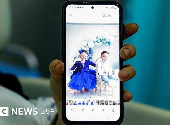 صدر الصورة، Getty Images التعليق على الصورة، والدة الأطفال القتلى، الجريحة أماني بزي، تعرض صورة أطفالها عبر...